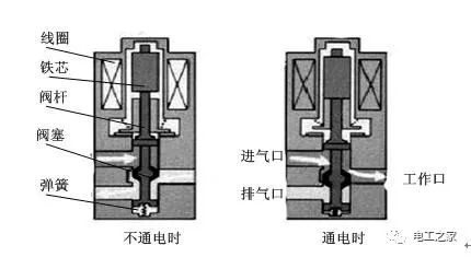 断电后,电磁吸力消失了,活动铁芯在弹簧的作用下回复到原来的位置,关闭了阀塞,于是工作介质停止了流动。对于常见的二位二通电磁阀也是这样的工作原理,只是阀上没有了排气口而已。