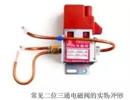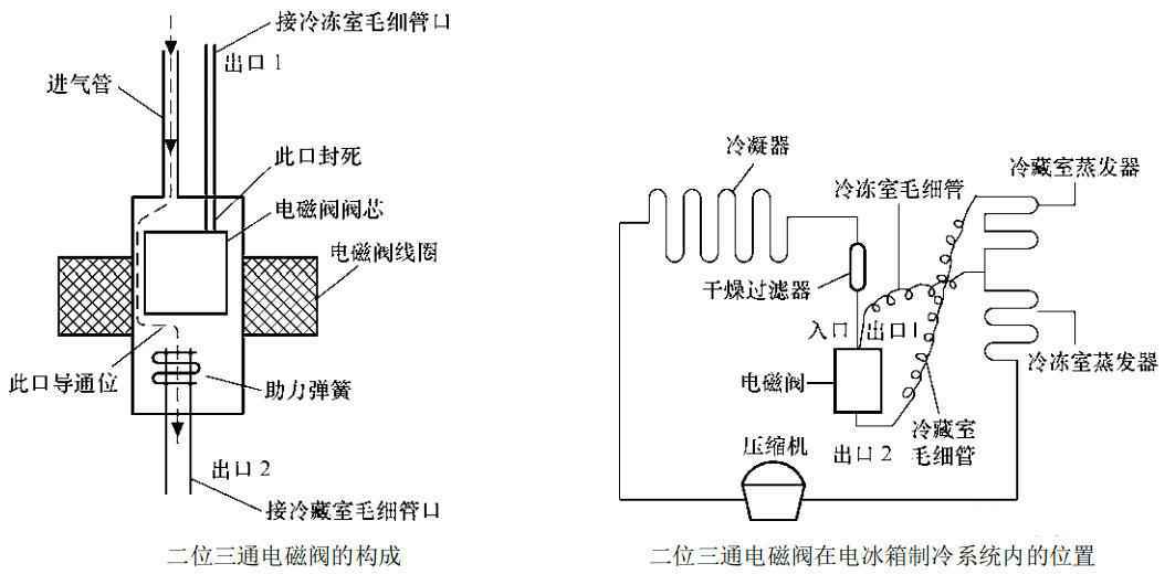 常见的二位三通电磁阀的实物外形如图,内部构成如图,在电冰箱制冷系统内的位置图如下所示。